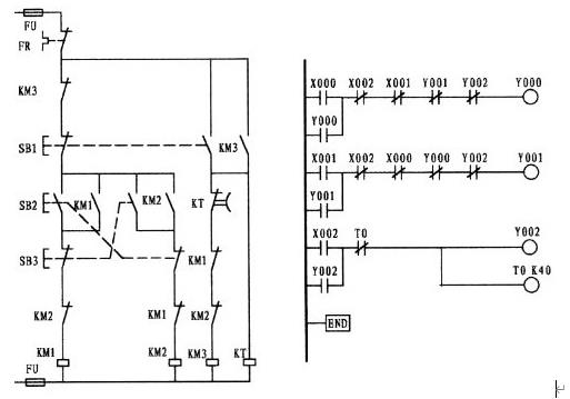 上圖的圖1為電原理圖,圖2則為按與原理圖一一對應的原則編繪的梯形圖,其特點是易于理解,但在我的印象中沒有幾張是可以這樣繪制的。如果采用這樣的方法繪制的話,將有可能走入不歸路。盡管二個圖都可運行,但如果將圖2加以改變而成為圖3 ,可以看出圖3在程序上少了一個步序ANB。簡潔明了是編程的要素。故而在編繪梯形圖時應盡量地將多觸頭并聯觸頭放置在梯形圖的母線一側可減少ANB指令。圖2中的X000、圖3中的X002均為外接熱繼電器所控制的常閉接點,而熱繼電器則用常開接點(或也可將外部的熱繼電器的常閉觸頭與接觸器線圈相串聯)。只有在畫出梯形圖后,再根據梯形圖編出程序。