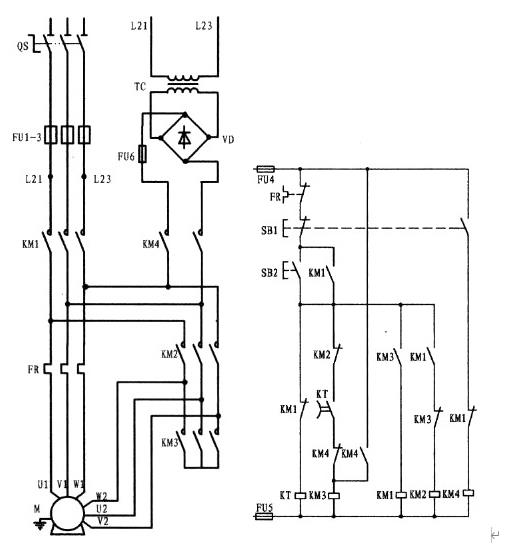 該線路控制的是一臺雙速電動機,一般的人對它不是很理解。電動機型號為YD123M-4/2,6.5/8KW,△/Y。根據型號解讀;該電機具有二種速度即4極和2極,在4極速度下,電動機的功率為6.5KW,繞組為三角形接法。如果在2極的速度下,電動機的功率為8KW,繞組為雙星接法。該電動機共有6接線頭,三角形接時(低速)電源由U1、V1、W1接入,其余接頭U2、V2、W2為懸空。星接時(高速)將接線頭U1、V1、W1接成星點形成了雙星點,三相電源則由U2、V2、W2輸入(電動機接線圖詳上圖所示)。該線路要求;電機可以在低速、高速狀態下擇其一運行。而在高速運行時則按低速啟動再轉為高速運行。自己可根據電原理圖進行分析。