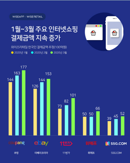2020年4月,WiseApp公布了韓國第一季度線上購物預估交易額,數(shù)據(jù)顯示,2020年頭三個月Coupang的交易額均超過了eBay韓國。