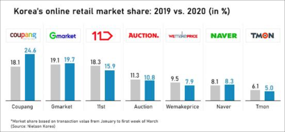 韓國電商平臺在今年1月1日至3月7日的交易量,圖片來自尼爾森韓國