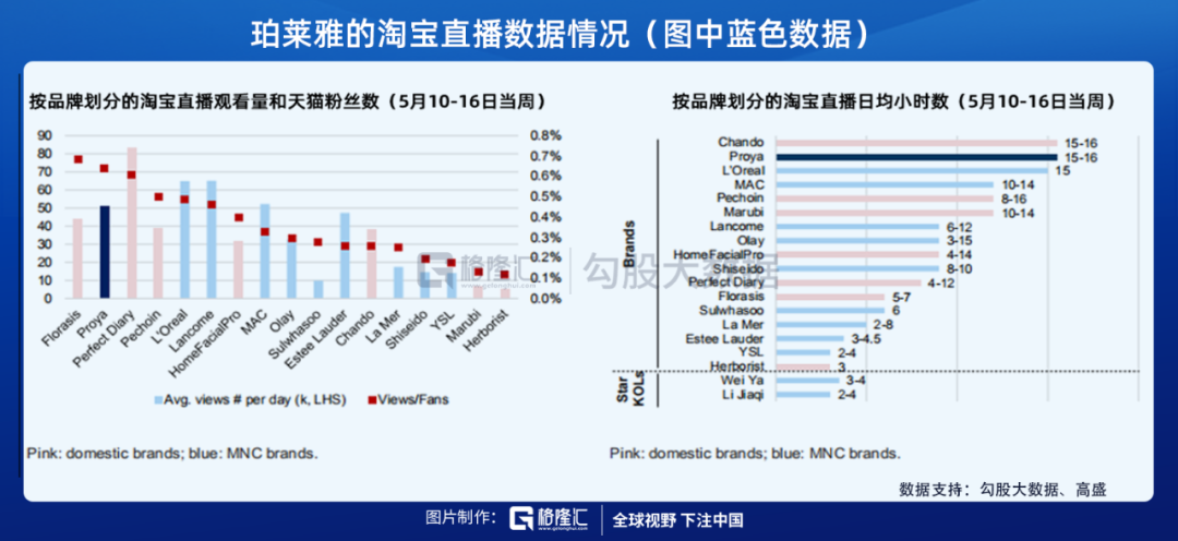 而且,與國產品牌相比,盡管國際大牌們的線上渠道占比較低,但它們也在加速線上布局,同時開始在低線城市開設專營店。今年6月以來,歐萊雅、雅詩蘭黛等國際品牌的淘寶直播場次排名已經沖到前列。無論在累計直播時長還是直播轉化率上,國產品牌和國際大牌之間并沒有明顯差距。